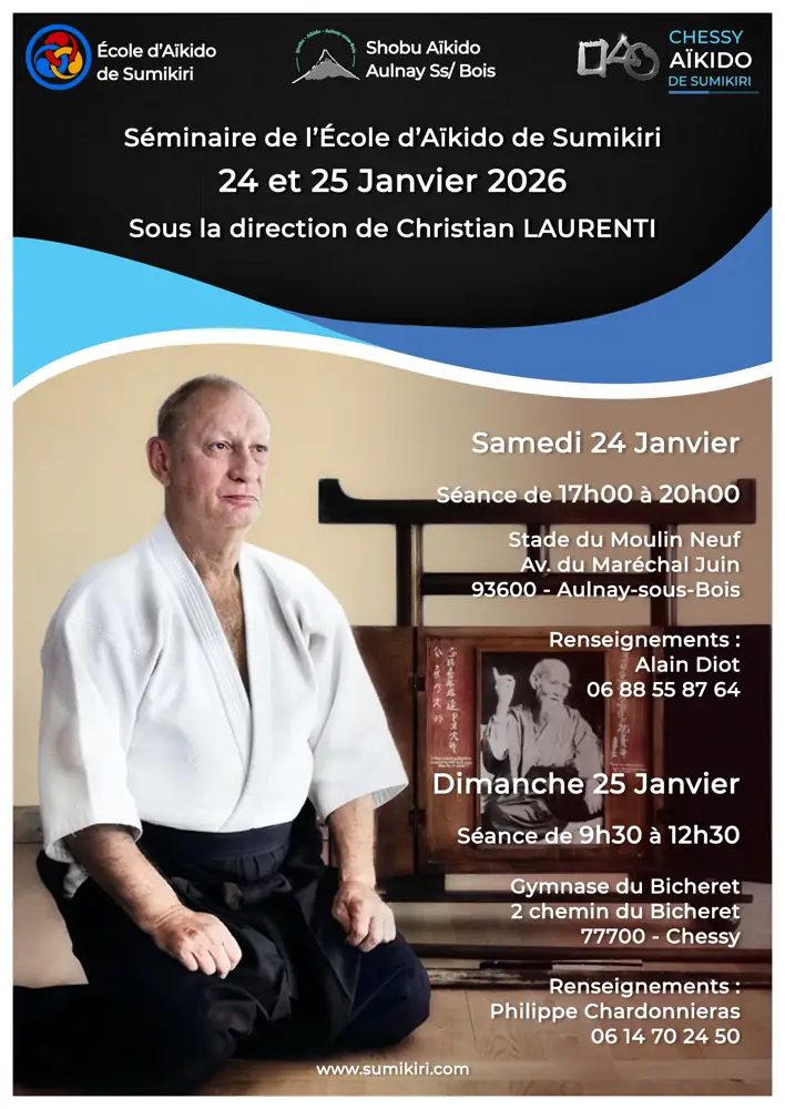 Les clubs d'Aulnay-sous-Bois et de Chessy proposent un stage animé par Christian Laurenti, Kaiden et conseiller technique de l'École d'Aïkido de Sumikiri.